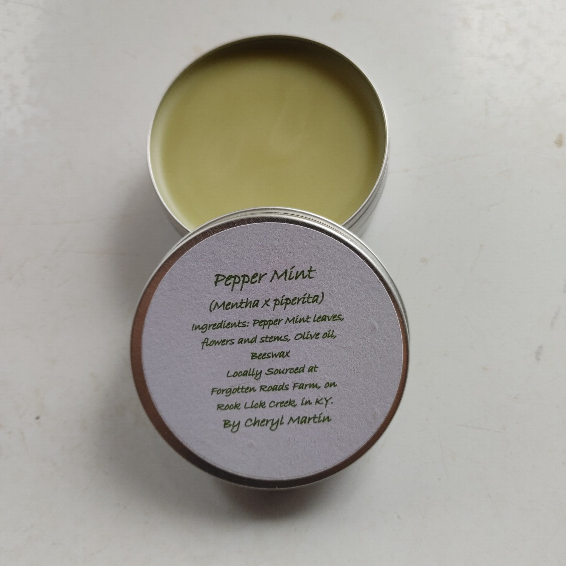 Ingredients: Pepper Mint leaves and stems, Olive oil, Beeswax